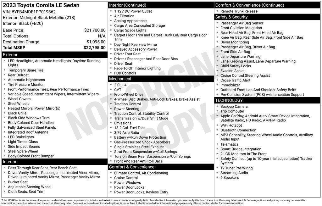 Elevate your driving experience with this stunning 2023 Toyota Corolla LE. Boasting a sleek black exterior, this compact sedan combines style and practicality, making it the perfect choice for your daily commute or weekend adventures.